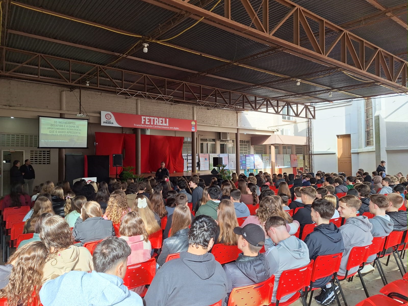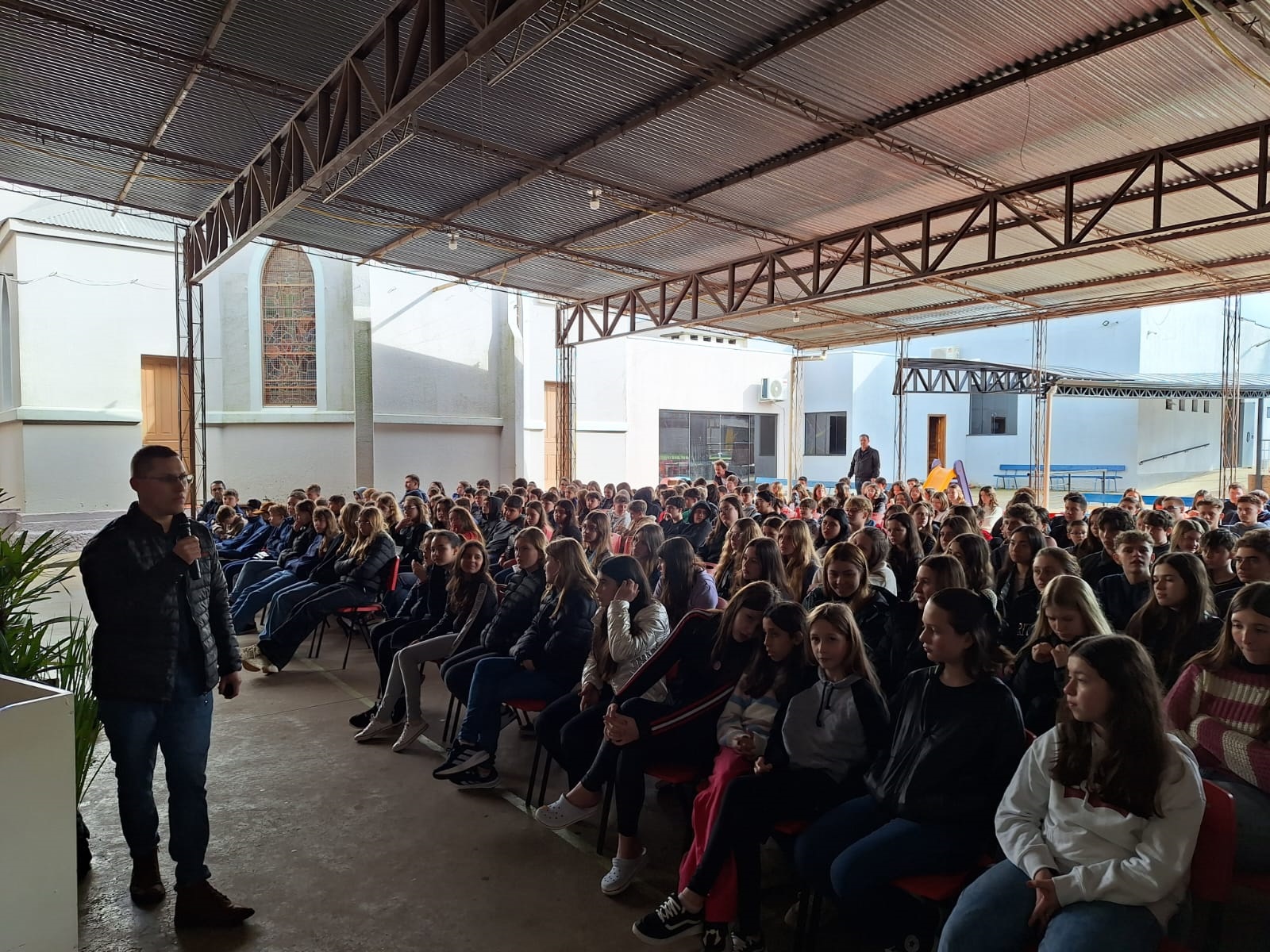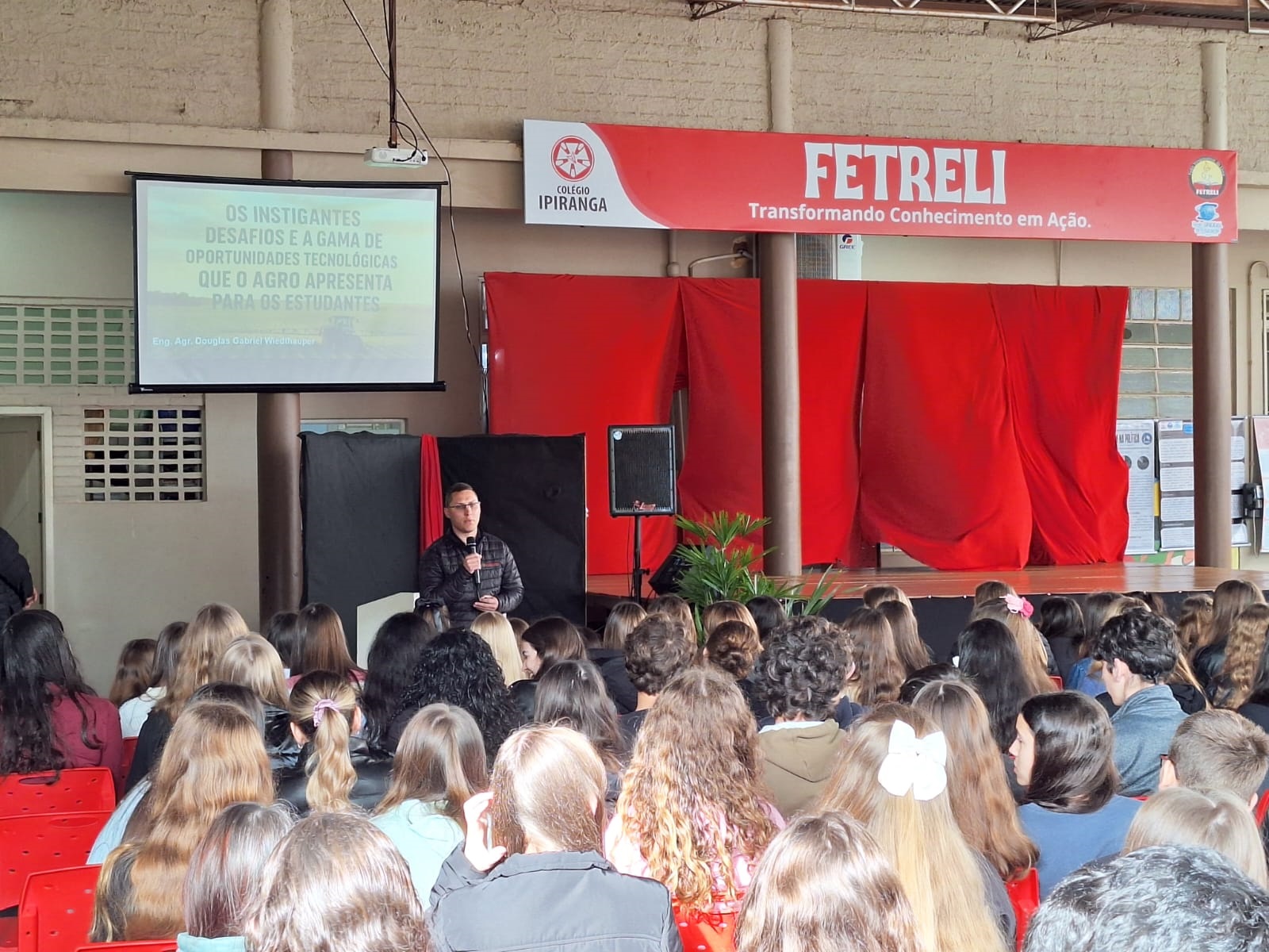 O engenheiro agrônomo, Douglas Wiedthauper, que integra o Departamento Técnico – DETEC Cotricampo, esteve palestrando na manhã desta terça-feira (09), durante a 51ª FETRELI – Feira Três-passense do Livro, promovida pelo Colégio Ipiranga. O tema abordado foi: “Os instigantes desafios e a gama de oportunidades tecnológicas que o agro apresenta para os estudantes”, a partir de um apanhado histórico sobre a evolução da agricultura no mundo, até os dias atuais, onde cada vez mais as tecnologias são aliadas dos produtores rurais, melhorando as condições de produtividade, de gestão rural e de sustentabilidade ambiental e econômica.