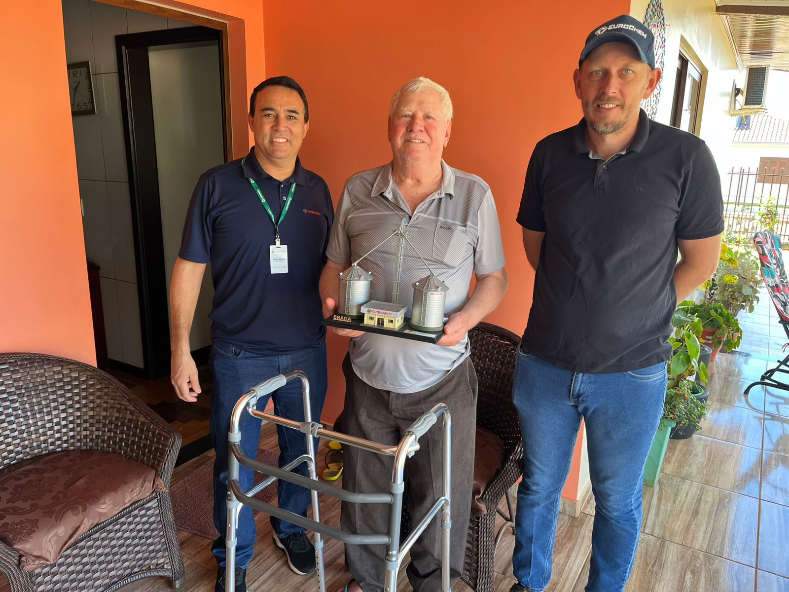 Em Braga, o gerente Enderson Viana e o Conselheiro Leomar Reichert realizaram a entrega aos produtores Nelson Lissa Dalpra, João Baldo, Ermozil Godoy da Silva, Norberto Dalla Libera, Sadi Carlos Formentini e Antônio Baldo.