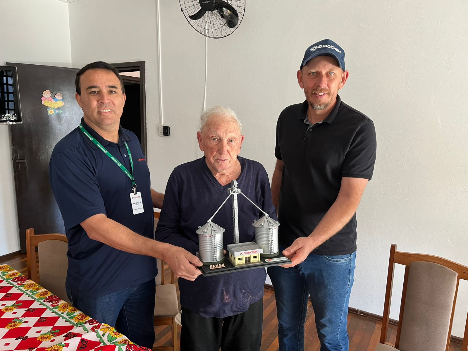 Em Sede Nova, o gerente Luis Antonio Franz e o Conselheiro Jones Luis Jung fizeram entrega ao associado Pulidorio Veríssimo de Jesus, 93 anos de idade, associado à Cotricampo a 53 anos.