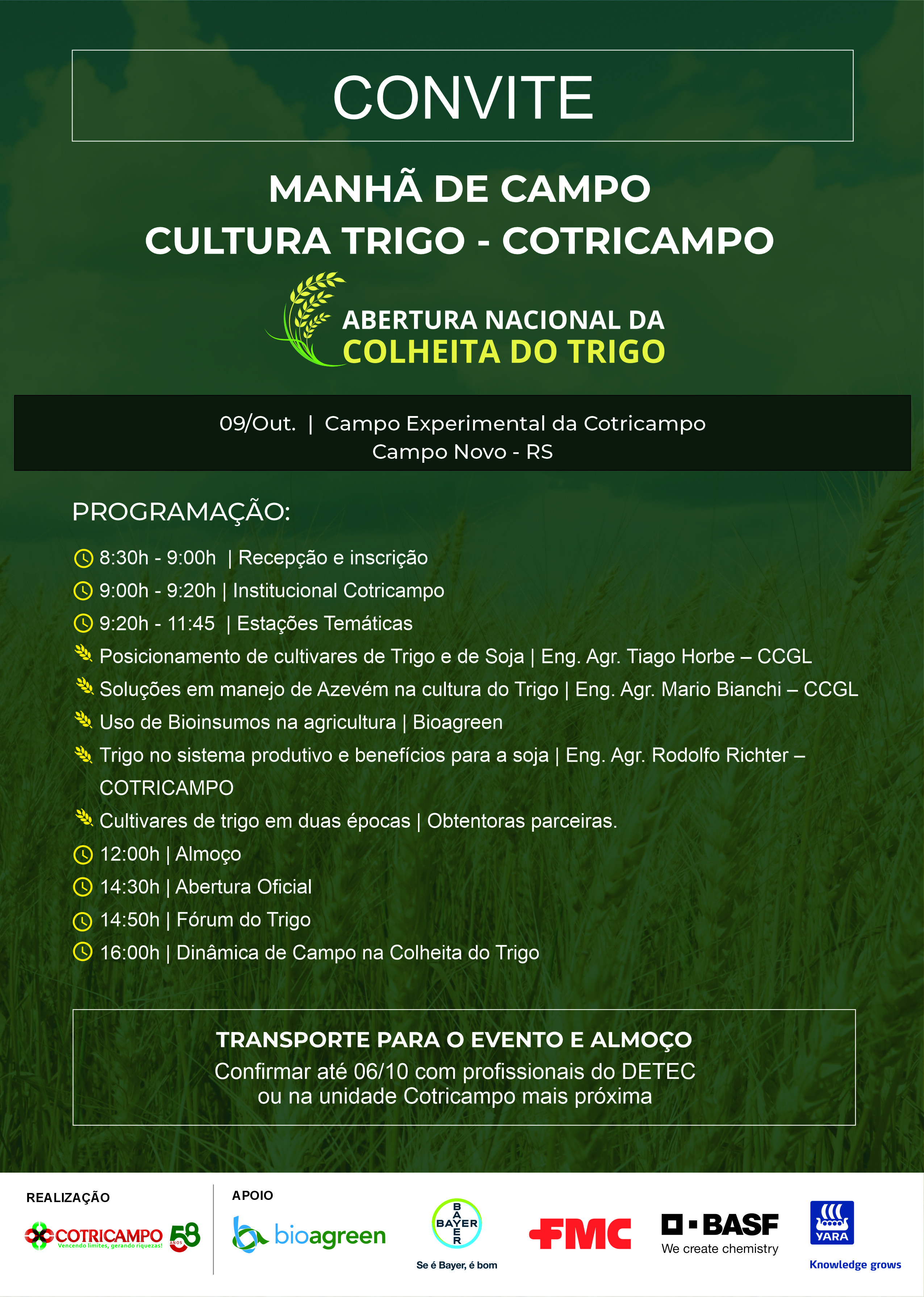 OBS: Participantes que desejarem transporte e almoço, devem entrar em contato com a unidade Cotricampo mais próxima ou com profissionais do Detec.