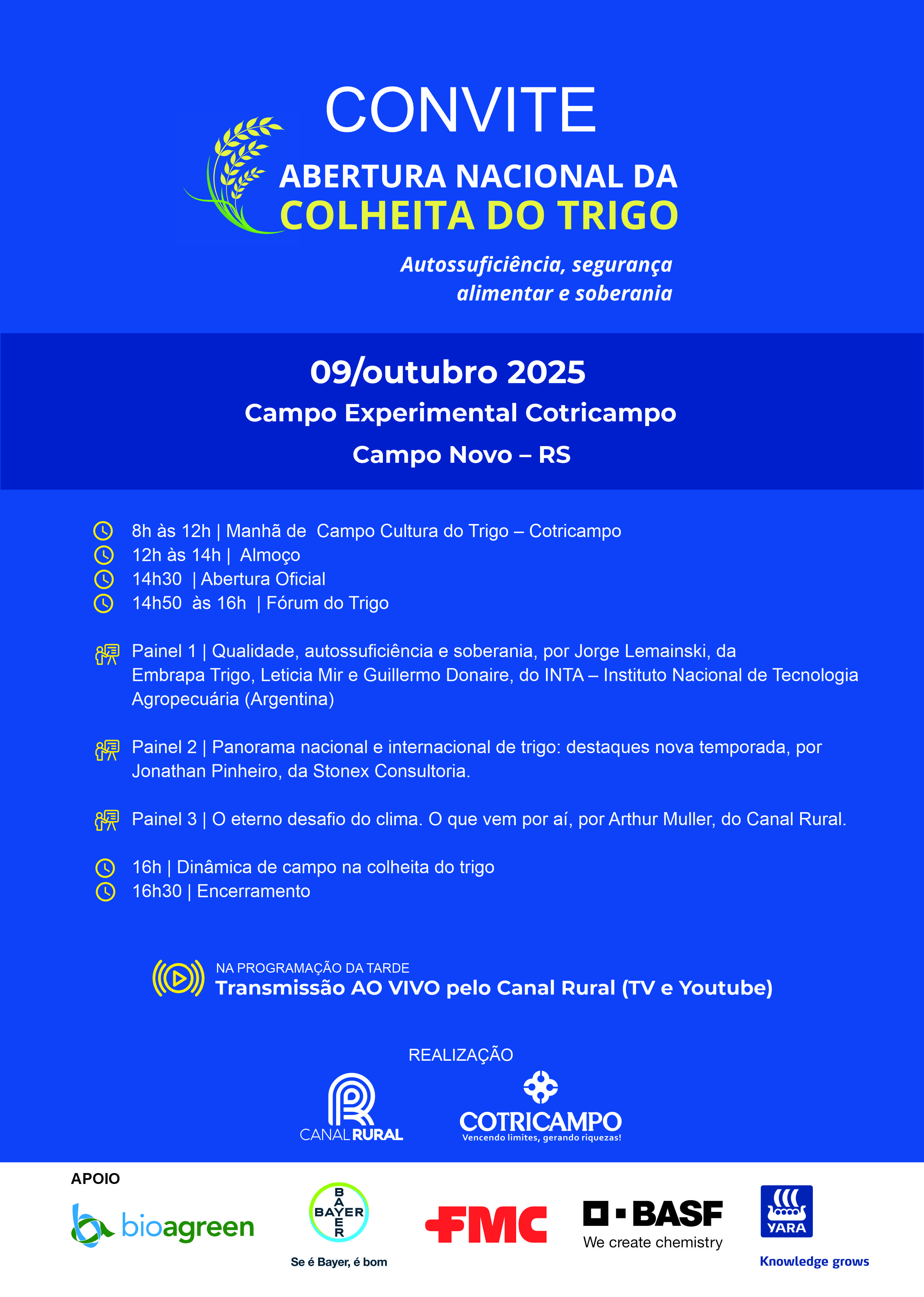 A abertura nacional colocará o Rio Grande do Sul e a região Noroeste em evidência, reforçando o papel de referência na cadeia produtiva do trigo, cereal estratégico para o país.