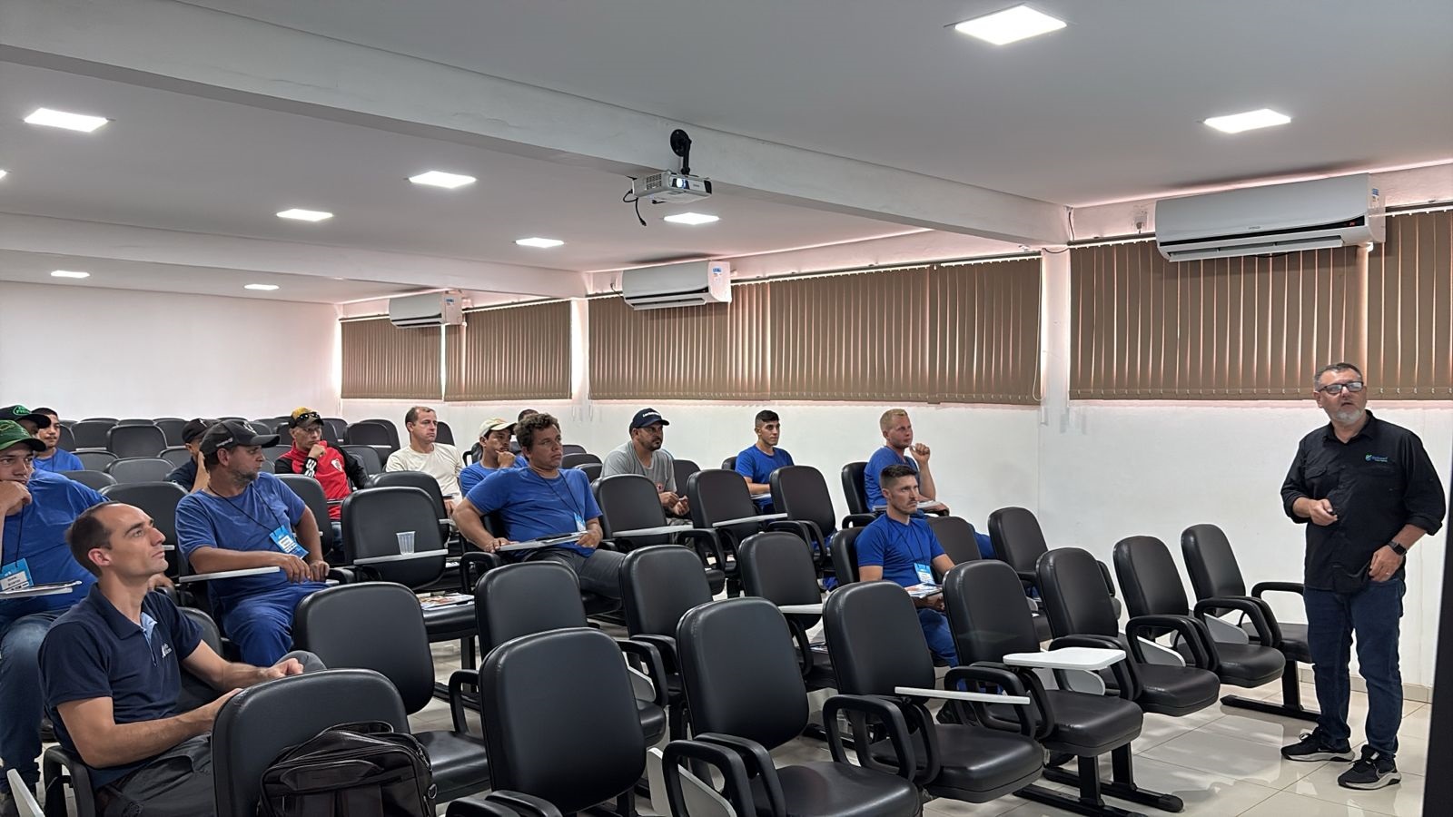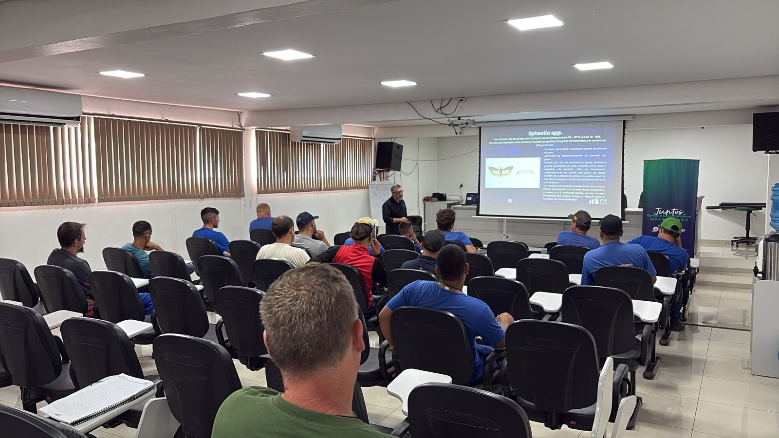 Os instrutores foram: Eduardo Ferraz Monteiro, especialista em armazenagem e conservação de grãos, instrutor da Websilos e profissional com ampla experiência prática em processos operacionais e capacitação de equipes em unidades armazenadoras em todo o país; além de Hilário Thevenet, engenheiro agrônomo, com atuação em pós-colheita, qualidade de grãos e manejo de pragas, trazendo visão técnica aplicada ao dia a dia das unidades e experiência prática na operação.